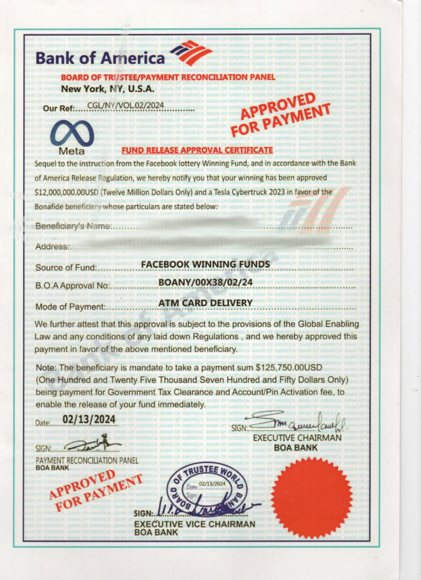 Brian Moynihan and Mark Zuckerberg are running a Facebook Lotto scam where they charge several thousand dollars in hidden fees paid with Bitcoin with promises for millions of dollars in winnings, access to an ATM card or cash. Once the fees are paid, they claim that a new fee is required, this continues on and on reaching over $30,000 USD with ZERO access to winnings. The classic 'Nigerian Scam', ironically their ATM card even ships from, you guessed it, Nigeria! They are using the Bitcoin to hide their transactions to purchase BofA and Meta stock to give the impression these companies are doing well. Both companies have numerous unreported real estate losses in Canada. More disclosures coming soon.